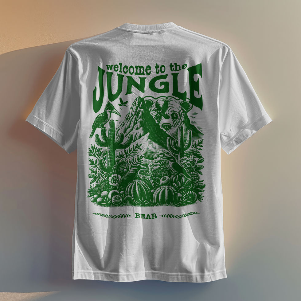 Welcome to the Jungle. The back print sets the tone - it’s a reminder that the wild is all around us, powerful and raw. The bear, just behind the mountains, is a symbol of strength, quietly watching over the land. On the front, Guardian of the Wild speaks directly to you. It’s not just a phrase - it’s a role. When you wear this, you become the protector of something greater than yourself, the jungle.